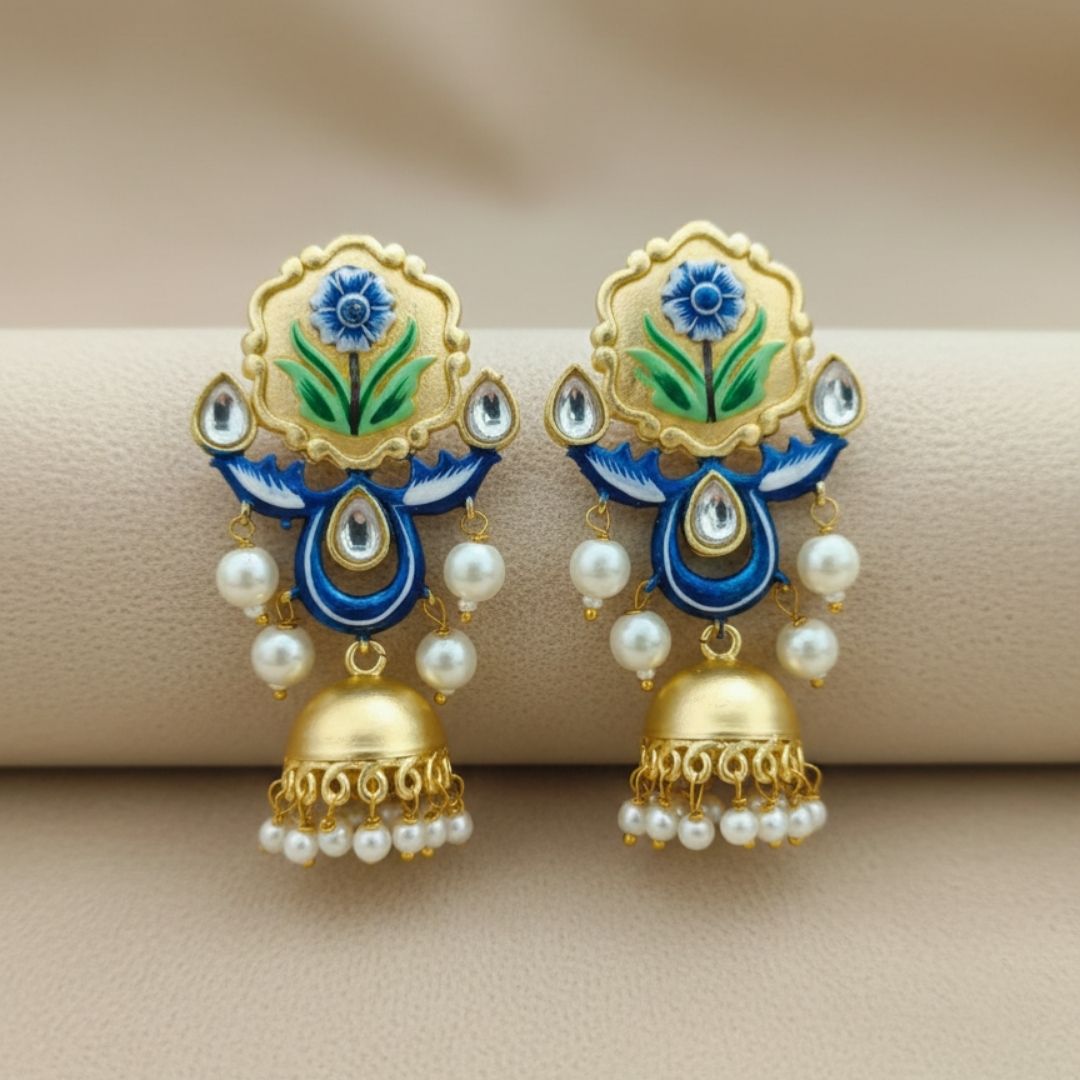 Blue & Green Hand-Painted Floral Kundan Jhumki Earrings