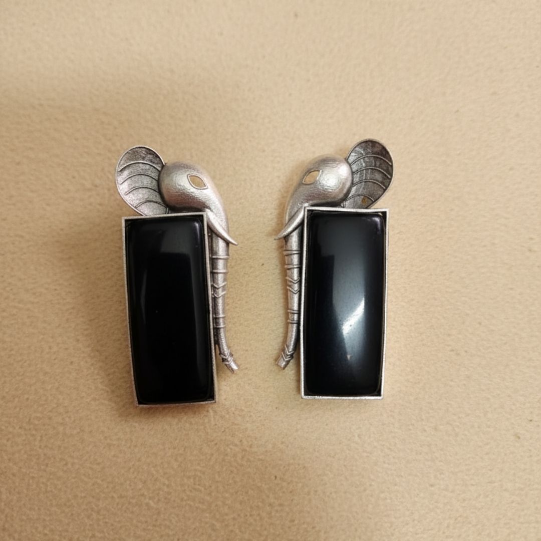 Make a bold cultural statement with these stunning Oxidised Silver Elephant Earrings, crafted with exquisite detailing and a refined antique finish. Each earring features a beautifully carved elephant head resting over a glossy rectangular black stone, creating a striking blend of tradition and contemporary design.
